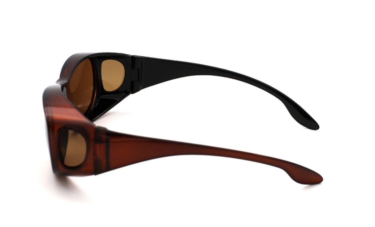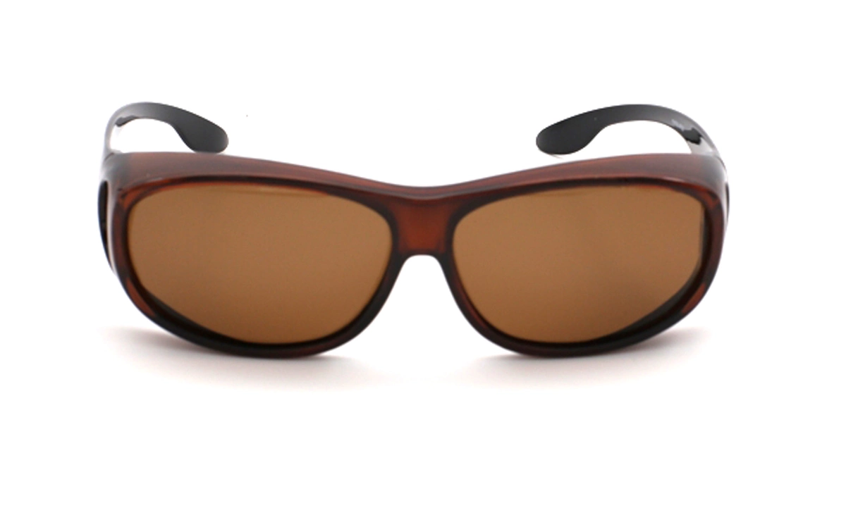 Zonnebril met bruin of tijgerprint montuur, die u over uw leesbril of voorgeschreven bril draagt